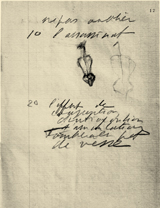 The earliest works are described as "spells." These are blessings and curses he wrote on charred or otherwise manipulated bits of paper and sent to friends, enemies, and a few public figures (Hitler, for one) in the late 1930s, in the wake of a disastrous trip he took to Ireland, wielding a cane that he believed was the staff of Saint Patrick, from which he returned in a straitjacket. (These spells are nowhere translated or transcribed, and the handwriting is often indecipherable. One of the few I could make out, addressed to the actor Roger Blin, reads, in part: "All those who have acted to prevent me from taking HEROIN all those who have laid a finger on Anne Manson [a friend] on account of that Sunday [illegible] May 1939, I will [illegible] them alive on a square in PARIS and I will cause them to be perforated and burn their marrow.")
