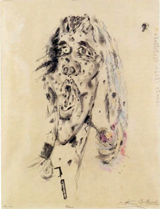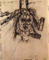 In 1946, the pencil work became heavier and more insistent, the colors more assertive, the nightmare aspects harder to miss. A work entitled The Theater of Cruelty, for example, shows a number of women apparently encased in glass coffins; an exceedingly cryptic stew of geometric and biomorphic elements is called The Sexual Awkwardness of God. In May 1946, he produced his first self-portrait. It is so heavily scored that it looks nearly sculptural, and it is covered with dots that look like smallpox--an essay in the catalogue cites Freud, by way of Gilles Deleuze, on the "schizophrenic aptitude for perceiving the surface and skin as if it were pierced with an infinite number of little holes." A Blue Head made around the same time is even scarier, caught in midscream, all covered with those diseased dots, with occluded eyes and a banana neck. It is, convincingly, a face from hell.