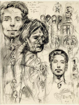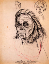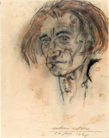 In 1947, Artaud moved from the psychiatric hospital at Rodez to a sort of halfway house at Ivry-sur-Seine, where he had more mobility and was able to receive visitors. These he drew, in a series of penetrating and quite varied portraits. Rolande Prevel, for example, is given almost a Matisse treatment, Colette Thomas is rendered with a delicacy that amounts to tenderness, while Jacques Prevel seems to have been sawn in two and restitched any old way, Mania Oïfer turned into an owl, Arthur Adamov fashioned from flung mud, with a penis for a nose. (Adamov was the author of PingPong and other plays; the other portrait subjects are mostly unknown to me.) Artaud was clearly an excellent draftsman but, as he notes, "you must look at [the drawings] and see what's inside." He also writes that "the human face is an empty force, a field of death," and that the alignment of form and content has never been farther off than in the contrast between facial features and what lies beneath them. His portraits are so uncompromising they make Picasso's or Giacometti's look polite.
