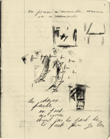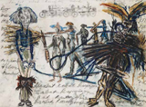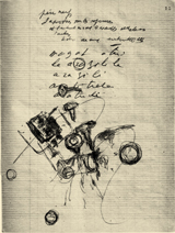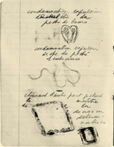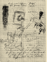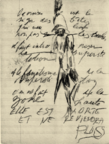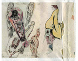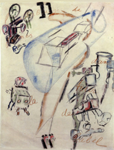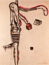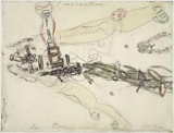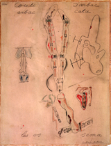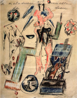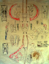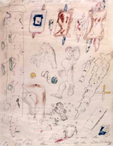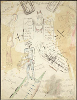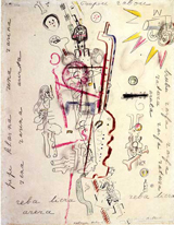Artaud began drawing in earnest around 1944. By 1945, he was making large tableaux of what he called hieroglyphics: fields of human figures, symbolic objects, and words, many of them in invented languages. Some of these drawings, in precise pencil with hints of color, have a diagrammatic quality that seems oddly evocative of Saul Steinberg's work; indeed, divorced from context, some might at first be mistaken as whimsical. There are multiple breasts, various penile objects, including cousins of Dalí's penis-on-crutch, and details that might derive from alchemical symbology.