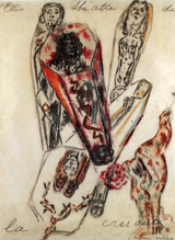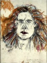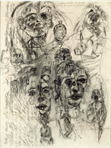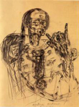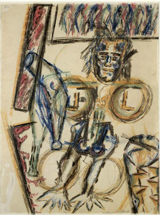 In 1946, the pencil work became heavier and more insistent, the colors more assertive, the nightmare aspects harder to miss. A work entitled The Theater of Cruelty, for example, shows a number of women apparently encased in glass coffins; an exceedingly cryptic stew of geometric and biomorphic elements is called The Sexual Awkwardness of God. In May 1946, he produced his first self-portrait. It is so heavily scored that it looks nearly sculptural, and it is covered with dots that look like smallpox--an essay in the catalogue cites Freud, by way of Gilles Deleuze, on the "schizophrenic aptitude for perceiving the surface and skin as if it were pierced with an infinite number of little holes." A Blue Head made around the same time is even scarier, caught in midscream, all covered with those diseased dots, with occluded eyes and a banana neck. It is, convincingly, a face from hell.