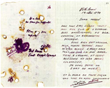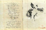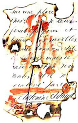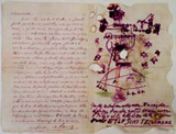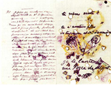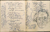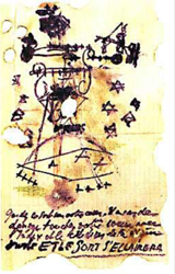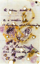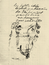 The earliest works are described as "spells." These are blessings and curses he wrote on charred or otherwise manipulated bits of paper and sent to friends, enemies, and a few public figures (Hitler, for one) in the late 1930s, in the wake of a disastrous trip he took to Ireland, wielding a cane that he believed was the staff of Saint Patrick, from which he returned in a straitjacket. (These spells are nowhere translated or transcribed, and the handwriting is often indecipherable. One of the few I could make out, addressed to the actor Roger Blin, reads, in part: "All those who have acted to prevent me from taking HEROIN all those who have laid a finger on Anne Manson [a friend] on account of that Sunday [illegible] May 1939, I will [illegible] them alive on a square in PARIS and I will cause them to be perforated and burn their marrow.")