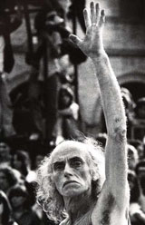 Perhaps I am in a unique position to speak on this legacy of the Living after his death, for I actually met the group while he lay in the hospital writing his last marvelous texts. Having never worked with him personally one could say I am part of the “after” generation. If one likes, one can look at the period “with Julian” and the period “after Julian” when studying the Living, but there is a risk of oversimplification, as many tend to do. If only life were that simple. Especially because the history of the Living is still being written. Still many have tried to ‘write off’ the Living as having finished their contribution to theatre creation. Yet those who express this idea really are uninformed and generally make up what I call the “cynical generation”: those deluded or critical of the 60’s, though they speak of it often. Looking at the Living today for example, or other political artists, these same people tend to lament: “oh but that’s been done already”. This theme of being a “Living legend” and the problem of style (the ‘Living’ style) and of creating new and vigorous work is an ongoing subject that we consistently confront. Certain ‘disobbediente’ (no-globalists), for example, commenting on a performance in Piazza Verdi (Bologna) criticized that our ‘peace and love’ style is no longer appropriate- as if their confrontational tactics and battles with the police are something new!