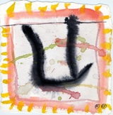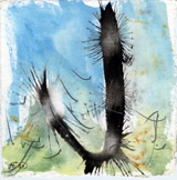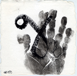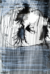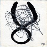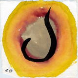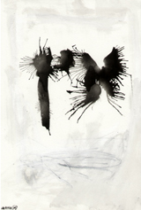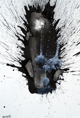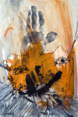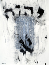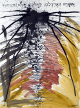 Hafftka emphasizes the mystical belief that the world was created by God through letters, and uses this theory to inform his work. He also seeks the devotional relationship to God dictated by Jewish religious practice through his experience of the text. Many of the works in fact bear the mark of his body—the inkblots are blown, containing the trace of his breath, an important theme in Judaism, as the word for breath and soul are the same (“neshama”). Other works, like the fifth image, contain a visible handprint in mottled black ink. For Hafftka, painting involves full bodily engagement. “I experience the Zohar as a conversation about the Scriptures that suggests traces of a hidden, supernal truth—a truth that may be explored with visual exegesis of a non-literal kind,” he writes.