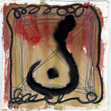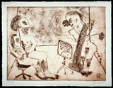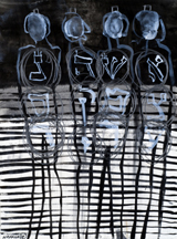 Just so does a 1993 figure, Christ of Avignon, appear both hopeless and resigned to his fate. Enmeshed in an agitated tangle of black and red brushstrokes laid over a more loosely worked dark-green and –blue backdrop, Hafftka’s Christ – a Jewish martyr, and a real man, beyond suffering – gazes at the viewer with his simple question, “Why?” He is a dazed, footless marionette whose strings have allowed his arms to fall at his sides, and his head to topple onto his shoulder. Yet he’s no more isolated than the figures in The Old Story, a nude man and woman seated at angles to one another and pointedly looking in different directions, or the open-mouthed figures seated on the ground in Forty Years, at the feet of the hooded skeleton blowing a trumpet.