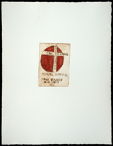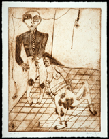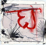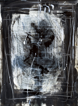 Yet more stark and more gestural, Fix shows two grotesque figures and the leering face of a third, emerging eerily from a luscious patch of ruddy pigment. More than merely nude, the two figures shown in some detail look like grotesquely animated corpses. One would be on the floor, lying on a side indicated by crudely painted black lines that indicate ribs, except that Hafftka shows no floor – and, indeed, no spatial parameters at all. The figures, one in a cowering position that has him gritting his lipless teeth and trying to move by using the single, slashed flipper that trails behind his truncated body and the other upright, seem to be adrift in some fathomless sea. Yet the standing man, his harshly highlit form spouting blood-red slashes, seems not so much to be rising from a murderous frenzy as recoiling at the sight of the fallen man, pulling back to hide behind the bland smiling mask that hovers before smears and swathes of red pigment.