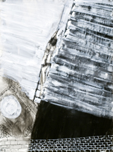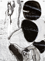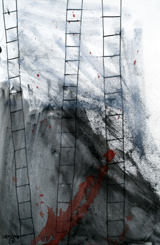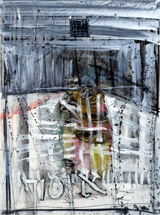 Nowhere is that more evident than in recent works, where the spidery veils of The Selecting Hand and the ominously blurred imagery of Stumble Dance have taken on greater solidity and specificity. A broad white band outlines the reclining and upright figures in Ninety Degrees, setting them apart from a background where red ladders seem to stand at the ready – perhaps to lead the ravaged recumbent woman straight to heaven, or possibly merely to hang a storm window. And while the narrative implied by the title and subject remains enigmatic, the tension between the fragmentary woman and the arm extended in what might be a healing gesture or, just as likely, fresh violence, together indicate passions barely held in check, and only for the moment in which Hafftka presents his ambiguous theater.