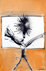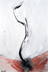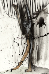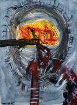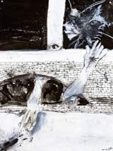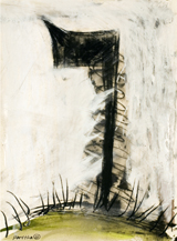 The Garden from which this figure is being expelled isn’t in Eden, however; it’s one where the graying forms of fallen figures are a tangled mass worthy of a Holocaust memorial, and where a background curtain of wavering vertical bands suggests a city of tall buildings, of lighted towers. Hafftka’s palette is muted but rich, with slashing lines of putrescent yellow the only deviation from his stark red/black/white combination. What is most remarkable is the brushwork, with its varied slashes and spatters of pure pigment forming a surface whose outrageous sensuousness only makes its colossal suffering all the stronger.