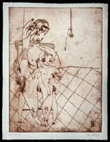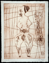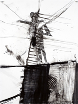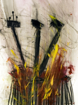 One of the artist’s strongest works is also among his most recent. Like others in New York, Hafftka was directly affected by the attacks of Sept. 11, 2001 and the World Trade Center towers’ collapse. The chaos of that day could already be glimpsed in his personal visions of suffering, torture, sacrifice and, paradoxically, everyday life; what is remarkable about works such as Survivors is that they extend the path Hafftka has been on for the past thirty years, and add new dimensions opened by new experiences. This spiritual change now appears apart from the subject itself, in this case a virtuosic depiction of an upright figure with only one leg, his head thrown back in horror and the thickened fingers of his over- sized hands clasped in Adam’s classic gesture of shame at his nakedness.