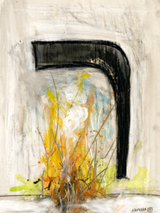 Hafftka is marked by the Holocaust and the attempt to rebuild faith in its wake. The son of two survivors who met in a displaced persons camp after the war, Hafftka uses art to access a spiritual world and connect to Judaism. This longing and sense of duty to rebuild the world led Hafftka to Yeshiva and to a Kibbutz in Israel in 1973, at the start of the Yom Kippur War, where he spent a year painting in a studio in a water tower; the experience instilled in him the connection between ritual and spirituality in art. For Hafftka, painting combines ritual and emotion, and through his synthesis of figuration and abstraction he hopes to create a visual language for religious devotion. Interested in the work of Francisco Goya, Francis Bacon, and Egon Shiele, Hafftka seeks to similarly confront human agony through the figure. In an interview with Hafftka in his Brooklyn studio, he said that he creates “with total faith in the moment of creation.” His paintings sustain the contradictions that mark Jewish faith and Hafftka’s worldview—they are depictions of tortured figures, sinewy, inky bodies stretched to the breaking point, drained of color, but these bleak abstractions are also splashed with deep oranges, soft watercolors, and peopled with the Hebrew Alphabet, which plays a large role in the Book of Concealment series. The mystical side of Judaism transcends rules and law, and similarly for Hafftka, painting offers revelation, however fleeting. “Art offered me a way to practice devotion and faith, not as idolatry, but as a form of prayer—and as a dialogue with the unknown,” he writes. The Zohar immerses the painter in the Biblical imagination, and through his work Hafftka offers a kind of open-ended exegesis, that he hopes includes the spectator in his quest for transcendence. He says, “Pictures are the experience of the meaning [of the Zohar].” Hafftka has worked through Genesis and the story of Noah (both previously exhibited at Yeshiva University) and the Book of Concealment represents his most recent engagement with the text. Made with watercolor, crayon, and ink, the works vary in size and feel. A careful reader can imagine connections between “the appearance of a long serpent, extending here and there” in the third citation, and the snake emerging from the figure’s mouth amidst a swirl of splayed ink. Other works are more elegiac, such as the twelfth image, in which the figures’ bodies take on the form and shape of the Hebrew letter “hey,” obstructed only by a smeared, gray hand. “Hebrew letters are as pliable as human figures,” Hafftka writes about the work. “The letters provide me with a visual springboard, which is at once verbal, human, archetypal and Jewish.” Hebrew letters populate many of the paintings, even spelling out the name of God in the sixth of the series, which is traditionally forbidden to be pronounced or written. The Hebrew letters and the figures in the paintings perform a similar kind of work, standing in for a complicated but beautiful relationship between language and the Jewish people.