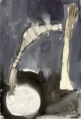 By the late eighties, as he explored “both the subject matter and the substance of paint,” Hafftka had refined his vision. The works that resulted in his masterpiece of that period, Ceremony, focused on figures crushed by the weight of the darkness surrounding them and turning inward, as if to reflect on the existential angst they were repressing beneath banal, non-committal expressions. The scrawled figure in Stumble Dance bends forward, vestigial eyes closed and flayed arms resting on crouching knees. Behind him in the inky, scumbled backdrop that resembles a horror-show stage in the 1985 work are dusty-white vertical columns – wells of light, perhaps, or dramatically exaggerated bars in the central figure’s personal, suffocatingly restrictive prison.