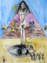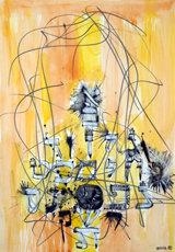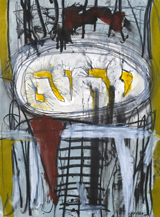 Almost defiantly, he crams his paintings with more information than the eye can see, and more details than the mind can process. His compounded theater of action is not primarily a visual concept; his main concern is with the emotions embodied in his subjects and, simultaneously, with our reactions to those subjects – both his own response, and that of the viewer. He works intuitively, striving to express in tangible form the sort of visionary impressions that he himself began to experience 30 years ago, while he was working on the Kibbutz. Yet he considers himself essentially a realist in the sense of drawing on an inner reality and giving it distinctive, urgent form and gesture.