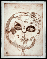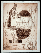 Disembodied and ghostly, a face hovers to the right of two truncated figures in the equally edgy work, The Observer and the Observed, its presence as inexplicable and irrational as the bright-eyed lamb in Chagall’s lyrical evocation of his Eastern European home, I And The Village. Here, with Hafftka, the drama is tinged with a modern, very personal ambiguity. In Hafftka’s painting, The Selecting Hand, similarly insubstantial, possibly imaginary forms appear against a backdrop whose sooty blackness is relieved only by smoky suggestions of random urban artifacts: stair steps leading nowhere, crenellated walls or gap-toothed fences through which a skeletal figure peers, amid rotting pilings rising from an invisible waterway, and fragmentary figures fading in and out of view.
