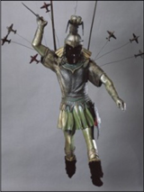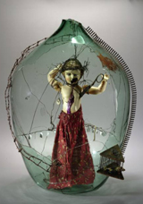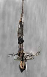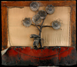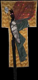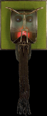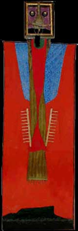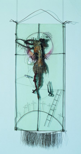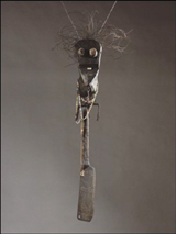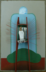 The critics and the public taunted him often that he toadied to the communists. That to their glory he created his fire birds. But he extolled life. The war burdened him enormously, so on the piles of scrap iron he placed the tatters of humanity. He liked to show scarred reality. He was difficult and impudent. It was not easy or pleasant. But no one was indifferent to his work. For Hasior constantly provoked, overpowered, compelled reflection. He was interested in everything that took place around him. He skillfully combined Polish culture, its traditions with pagan ways. There were thus holy Christian images and pagan idols. He collected on overgrown paths and roads the oddest "wonders." He search junk-piles for old, deformed, useless items. And he created from them a different, a little magical and a little twisted world. His monstrous banners assembled within them the beauty and esthetic of his art. It was these that symbolized the greatness and pride of the artist in his art and motherland. He always looked upon them with emotion and personal pride. Hasior's oeuvre is a portrait of his innermost , the conditions of his mind and soul. Creations that were uneasy and not always beautiful. But great and unique. He frequently would say of himself: I am but a ordinary tinkerer, I like to putt around and create something from nothing. The Academy of Fine Arts gave me just a diploma. And what I make and create comes from my hands and mind. I am a tinkerer-craftsman. That he was great, his life attested, even in its humility. He attached no importance to the accolades of this world. His needs were satisfied by a denim suit and a bottle of red wine. He parted unwillingly with his creations. But he had to sell them, to survive.
