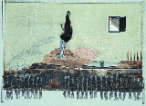 Five minutes later he arrived with cold tea, half of which was already in the saucer. At this point I asked my first question. I was interested in how he viewed the future of art and culture in the computer age. Hasior laughed, "Come over here," he whispered, walking toward a pyramid of slides. He showed me them without a word, smiling the whole time. The pictures were old. I figured they were his work. Many pictures had been pasted together from two different photographs-creating a contrast between two seemingly distinct images. The photographs were an accumulation of disorderly placed objects, geometric concrete forms, landscapes and propaganda slogans clashing with the actual appearance of cities, roads and buildings.