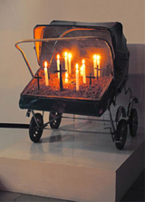 Other works than should be mentioned in this context are Golgotha a monument with live fire which he created in 1972 in Montevideo, Uruguay, the Pieta on Fire he created that same year in Copenhagen, and the Chariot of the Sun (solspann) in Sodertalje, a town 30 km south of Stockholm. The latter sculpture is located on a hill overlooking the canal that transects the town. Interestingly, a local custom has arisen where, annually, on a night in August artists and other gather on the hill and illuminate the sculpture with fire.