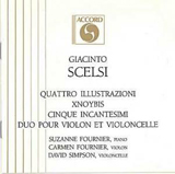 The Four Illustrations and Five Incantations are recorded by Suzanne Fournier on Accord 200742. These works are much shorter than the Suites 8 & 9, and the Four Illustrations in particular is more concentrated in form. This piece is in four movements describing four avatars of Vishnu, and might be said to correspond roughly to a sonata -- in particular the Four Illustrations occupy the same position in Scelsi's middle output with respect to the piano sonata as does the massive orchestral work Aion with respect to the symphony. Both conclude with slow, fading resolutions. The Four Illustrations is charged with a variety of ideas, and is a piece I continue to find fascinating after more than a hundred hearings -- I have little doubt that it is Scelsi's finest piano piece. For the most part it is a slow work based on murky passage-work in the middle registers and subtle interactions between the movements; the violent Varaha Avatar (as scherzo) is the exception. The Four Illustrations begins Scelsi's concentration on slow and static music. The Five Incantations are much simpler in conception -- though quite virtuosic pianistically, each is basically independent with a clearly identifiable theme. They might be described as rhapsodies, or possibly etudes.