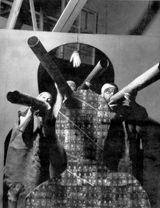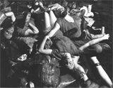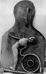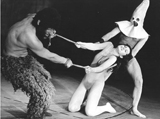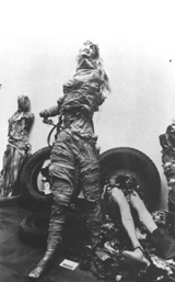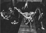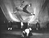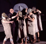 La construction de notre spectacle a pour matériau les faits scéniques de pure invention. Les situations fictives, le jeu que nous proposons sont a peine vraisemblables dans la vie. L'action se passe dans un temps indéterminé dont l'écoulement devient sans importance. C'est un montage d'action dont la suite des faits en apparence sans rapport les uns avec les autres, se trouve intégrée dans une sorte d'anecdote de la sensation des faits scéniques, visuels. Le jeu de dissonances constitue a la fois le langage et l'harmonie de ce spectacle. Cette mécanique libère des chocs, des conflits tragiques et comiques, elle met en évidence l'interdépendance des hommes et des choses, des objets et des significations, des sensations et des impulsions. Le décor y cede le pas devant un art plastique imaginatif, composé et gancé par les objets qui font partie du spectacle. Le son et la lumière y sont mis au service des actions expressives; en intervenant dans l'action, ils reculent les limites des sensations émotives du spectateur. Librement différenciés par leur matière (plastic, toile de jute, papier) et par l'assortiment d'éléments inhabituels (masques à gaz, pellicule, boîtes à conserves), les costumes des acteurs obéissent au principe de l'unité de l'idée et de la forme et non pas à celui d'une reproduction naturaliste de la réalité ou d'un style historique. La personnalité de l'acteur est mise en relief par des actions qui lui servent de tremplin à des transformations soudaines et qui désagrègent son caractère "monolithique"; elles l'aident à composer son rôle et soulignent sa personnalité créatrice. Le jeu des contrastes du silence et du bruit, des rythmes accélérés et ralentis,provoque et condense l'inquiétude en pénétrant jusqu'au tréfonds caché des sensations inconscientes. La récurrences des scènes met à nu l'automatisme et la passivité des actions,le choc volontaire provoqué par la juxtapositions des scènes d'un caractère différent met en évidence la nature éphémère des structures intellectuelles et esthétiques. La simultanéité du jeu et de l'imagination, l'intégration de tous les moyens qui sont propres au théâtre nous permet de pénétrer jusqu'au fond même des dissonances qui révèle la complexité et les contradictions de notre époque.