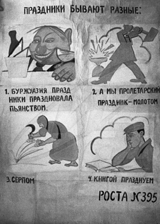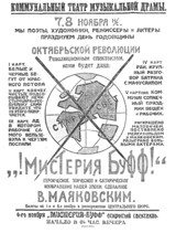 1917-1923— When the Russian Revolution broke out, Mayakovsky was wholeheartedly for the Bolsheviks. Such poems as "Oda revolutsi" (1918; "Ode to Revolution") and "Levy marsh" (1919; "Left March") became very popular. So too did his Misteriya-buff (first performed 1921; "Mystery-Bouffe"), a drama representing a universal flood and the subsequent joyful triumph of the "Unclean" (the proletarians) over the "Clean" (the bourgeoisie).