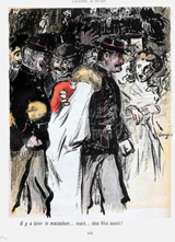 Mais son pays, il le sait, c’est Paris qu’il retrouve, définitivement cette fois, au tout début de l’année 1899. Son dessin témoigne du jeune artiste en recherche esthétique. Ainsi, sans doute influencé par le «Nouveau style» du symboliste Jan Toorop – à qui deux expositions venaient d’être consacrées à Rotterdam en 1896 – il déploie, à la même époque, des lignes ondulantes dans ses illustrations pour Jonker Frans, «Symbole de la décadence de Piet De Moor», pour la couverture de «Die Anarchie» de Pierre Kropotkine (La Haye) ou encore pour le bandeau d’ouverture d’une «Chanson de Bilitis» publiée dans L’Image (n°11 – octobre 1897). Le critique Félix Fénéon, et la cooptation fréquente entre artistes, facilitent l’entrée de Van Dongen dans divers titres de la presse de gauche ou anarchiste. Ainsi, nous le retrouvons dans le quotidien Le Journal et son supplément littéraire, Le Journal pour tous, à La Caricature et dans Les Temps Nouveaux. Maintenant, c’est plutôt l’influence de Toulouse-Lautrec et surtout de Steinlen que trahissent les dessins qu’il livre pour le journal satirique anarchiste L’Assiette au beurre, de 1901 (n°12 du 20 juin) à 1903 (n°140 du 5 décembre), participant à plusieurs numéros spéciaux dont un sur la prostitution: «Petite histoire pour petits et grands nenfants» (n°30). Le sombre domine dans ces illustrations, à la fois par le trait noir gras des dessins tirés sur un méchant papier (parfois gris-vert) et par les sordides situations décrites et dénoncées. Cependant, son sens de la couleur n’échappe pas au directeur de L’Assiette au beurre, Samuel Schwarz, qui sollicite l’artiste pour mettre quelques couleurs aux compositions d’autres collaborateurs. Ainsi, pour les illustrations de H. G. Ibels dans le numéro spécial 273 du 23 juin 1906 sur «Les Beuglants de province».